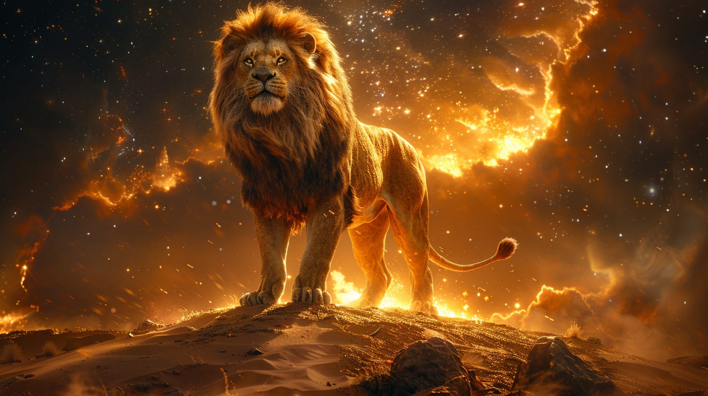 A photorealistic image of a powerful lion standing atop a dune in a vast desert under the Milky Way, his golden mane illuminated by the light of a thousand stars, glowing with cosmic energy, a gentle desert wind swirling around him. The night sky stretches infinitely behind, filled with a rich tapestry of stars. Subtle shadows and highlights from the starlight bring out the lion's majestic presence. Ultra-high detail, soft lighting, hd quality, inspired by cosmic surrealism, long exposure photography, cinematic lighting, slight motion blur in the wind, --ar 16:9 --v 6.0 --s 750 Merci d’avoir lu cette newsletter et on se revoit au prochain numéro 💜 !